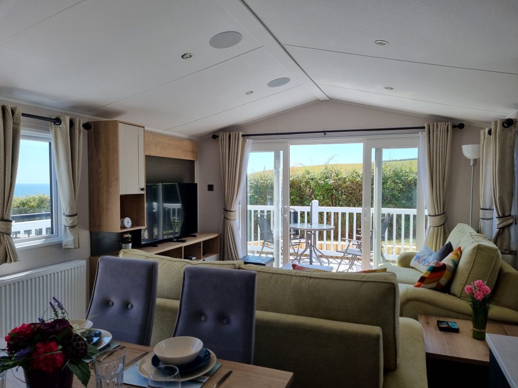 South facing wrap around decking at the front of our caravan overlooks fields and the sea and is very private and quiet.
